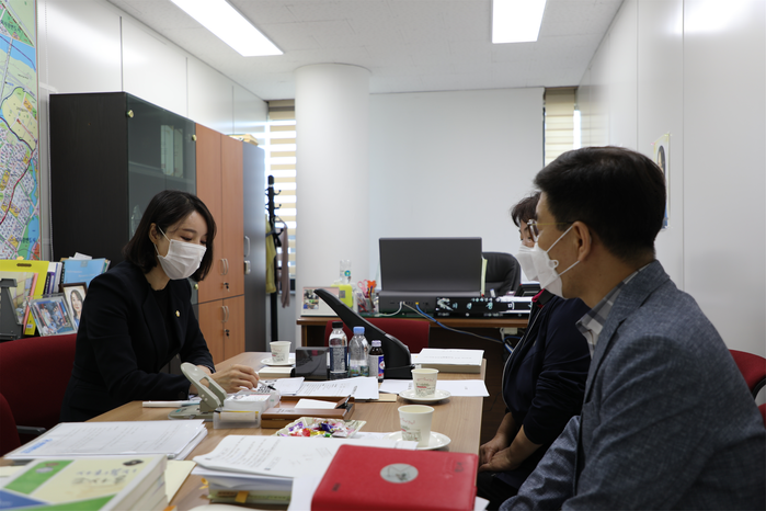 | ▲ 정미옥 의원이 대한적십자사 남부혈액원으로부터 강동구 헌혈장려물품 지원에 대한 결과를 보고 받고 있다. (사진제공=강동구의회) |