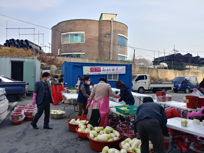 충남 홍성군지역사회보장협의체 여성·가족분과는 지난 16일 ‘겨울 김장 동치미 담기’ 봉사활동에 나서 20kg(약 100통)가량의 동치미를 만들어 지역내 홀몸노인 및 어려운 가정에 전달됐다. 사진은 이날 참여한 봉사자들이 동치미를 만들고 있는 모습. (사진제공=홍성군청)