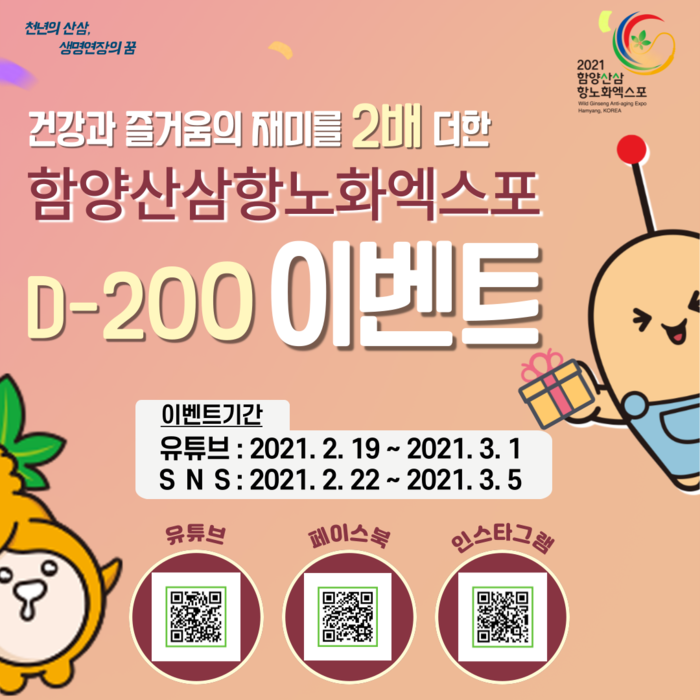 2021함양산삼항노화엑스포조직위원회(위원장 김경수 경상남도지사)가 함양산삼항노화엑스포 개최 D-200(2월 22일)을 맞이하여 다양한 온라인 이벤트를 진행한다.
