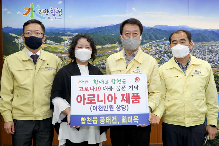 합천읍에 거주하는 공태건, 최미옥 부부는 지난 9일 합천군청을 방문하여 코로나19 극복을 위해 사용해 달라며 2천만원 상당의 아로니아로 만든 건강보조식품을 기탁했다.