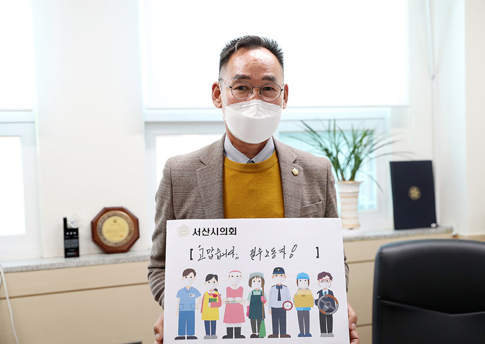 [서산=최진우 기자] 9일 충남 서산시의회 이수의 부의장이 보건의료, 돌봄, 환경미화, 운송·배달 종사자 등 분야에 종사 중인 필수노동자들을 격려하고 응원하는 ‘고맙습니다! 필수노동자’ 캠페인에 함께했다.