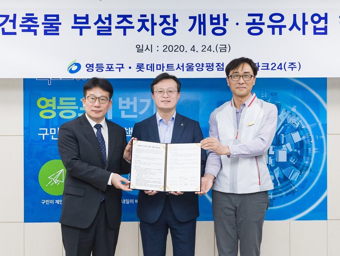 서울 영등포구는 최근 롯데마트 서울 양평점과 ‘건축물 부설주차장 개방·공유 사업’ 업무협약을 체결하고 롯데마트 부설주차장 180면을 2년간 주민들에게 개방하기로 했다. 사진은 채현일 구청장(가운데)과 관계자들이 기념촬영을 하는 모습. (사진제공=영등포구청)