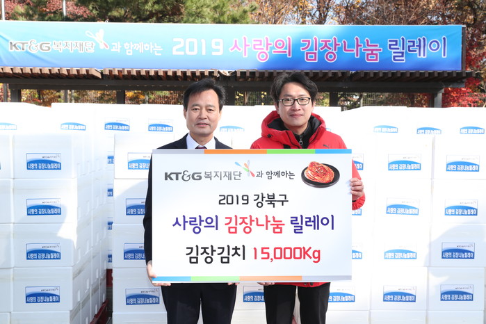 서울 강북구가 최근 KT&G복지재단과 함께 우이동 만남의 광장에서 '2019 사랑의 김장나눔 릴레이 행사'를 진행하고 재단으로부터 김치 1만5000kg을 기부받아 지역내 저소득 가구에 전달했다. 사진은 박겸수 구청장(왼쪽)과 관계자의 기념촬영 모습. (사진제공=강북구청)