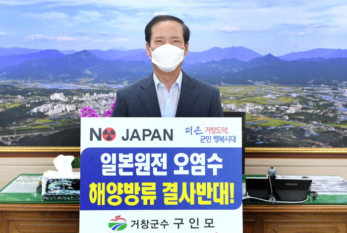 구인모 거창군수는 “일본 정부가 자국 이익만을 위해 원전 오염수를 일방적으로 방류 결정한 것은 인접국인 우리나라뿐만 아니라 전 세계 해양생태계를 위협하는 비윤리적 행위”라며, “국제사회의 오염수 방류 반대 목소리를 수렴하여 지금이라도 방류 결정을 철회하고 투명하고 책임성 있는 오염수 처리 방안을 제시해야 한다”고 규탄했다.