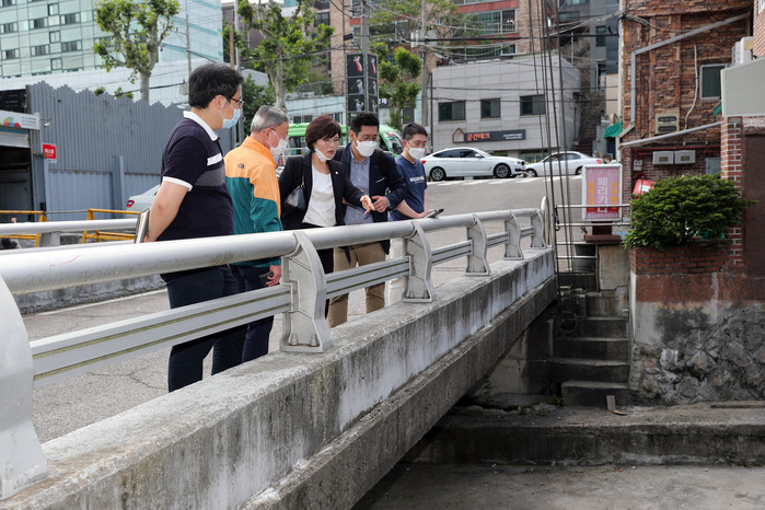| ▲ 관계자들과 홍제천 산책로 조성사업 현장을 방문한 노진경 의원(가운데)가 현장을 살피며 의견을 나누고 있다. (사진제공=종로구청) |