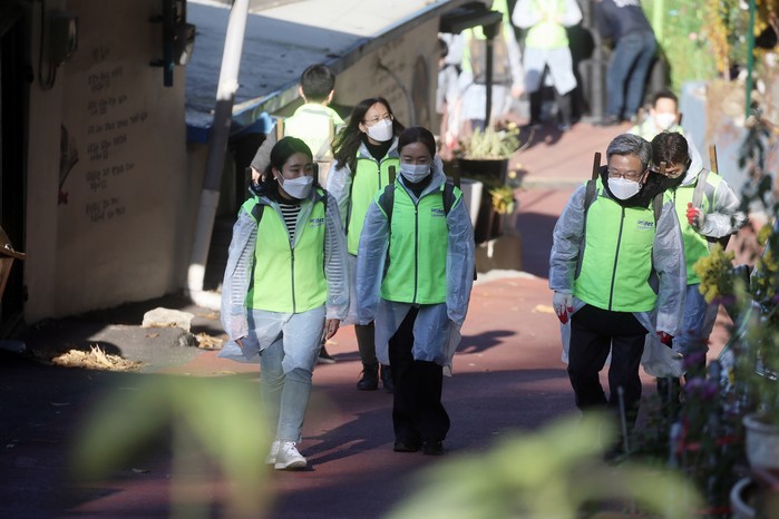 이원재 인천경제자유구역청장과 직원, 인천경제자유구역(IFEZ) 입주기업 관계자 등 100여명이 10일 미추홀구 학익동을 찾아 저소득층 가구에 3000여장의 ‘사랑의 연탄’을 배달했다. 사진은 이 청장(오른쪽)이 참석자와 함께 연탄을 나르고 있는 모습. (사진제공=인천경제자유구역청)