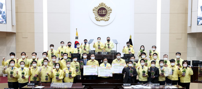 인천시의회가 코로나19로 인해 경제적 어려움을 겪고 있는 인천지역 화훼농가를 돕기 위해 ‘제269회 임시회’ 본회의장에서 ‘시의회와 함께하는 화훼농가 돕기 릴레이 캠페인’ 개시식을 했다. 이번 캠페인은 릴레이 챌린지 형식으로 3~4월 진행된다. 사진은 꽃을 들고 있는 의원들과 관계자들의 모습. (사진제공=인천시의회)