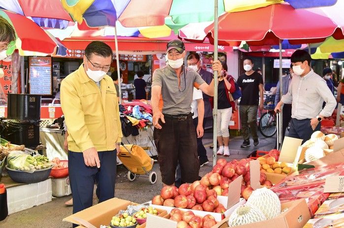 류경기 서울 중랑구청장은 추석 명절을 앞두고 14일 장미제일시장과 동부시장 방문을 시작으로 16일까지 3일간 지역내 전통시장 7곳을 찾아 현장을 살핀다. 사진은 14일 류 구청장(가운데)이 동부시장을 방문해 현장을 살피고 상인들과 대화를 나누고 있는 모습. (사진제공=중랑구청)