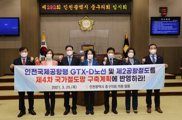 [인천=문찬식 기자] 인천 중구의회는 25일 제292회 임시회 제2차 본회의에서 구의원 전원이 공동발의한 ‘인천국제공항행 GTX-D노선 및 제2공항철도의 제4차 국가철도망 구축계획 반영 촉구 결의안’을 채택했다.