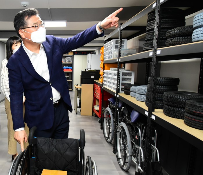 중랑구가 지난 23일 장애인 이동기기 수리센터(동일로 136길 23) 개소식을 개최했다. 센터는 이동기기 점검 및 수리, 세척, 무료대여 등 다양한 서비스를 제공한다. 사진은 개소식에서 류경기 구청장이 센터 내부를 둘러보고 있는 모습. (사진제공=중랑구청)