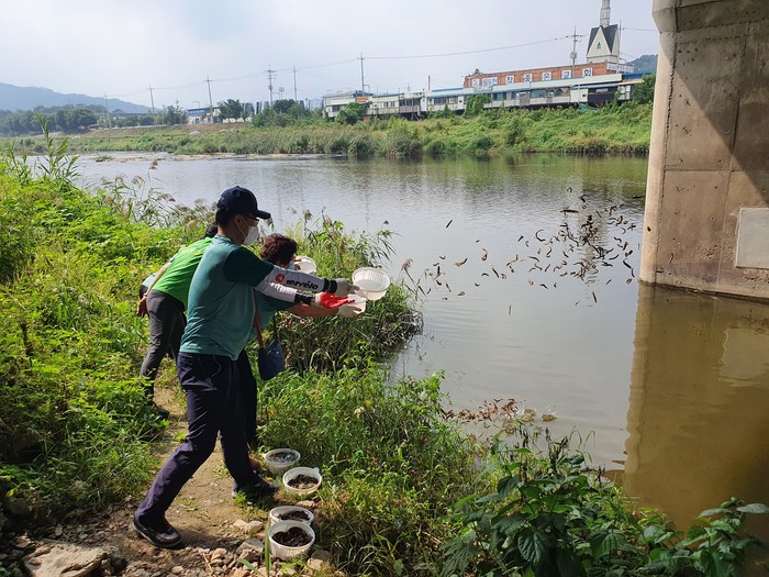 경기 동두천시 생연2동 새마을남녀지도자협의회는 최근 송내동 새마을남녀지도자협의회와 합동으로 신천 수질개선을 위해 ‘EM흙공’을 투척하고 ‘미꾸라지’를 방생하는 환경정화 활동을 진행했다. 사진은 참여자들이 미꾸라지를 방생하고 있는 모습. (사진제공=동두천시청)