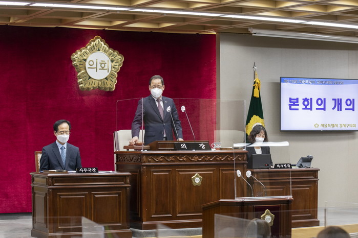 이의걸 의장은 개회사를 통해 "따뜻해지는 날씨에 외출과 접촉이 늘어나는 가운데 일상 곳곳에서 산발적인 집단 감염이 발생해 구민들의 불안과 소상공인들의 어려움이 가중되는 실정이다"며 "우리 모두가 코로나19 종식을 위해 백신 접종과 철저한 생활 방역 지침에 적극 협조해 위기를 잘 이겨내야 한다"고 당부했다.