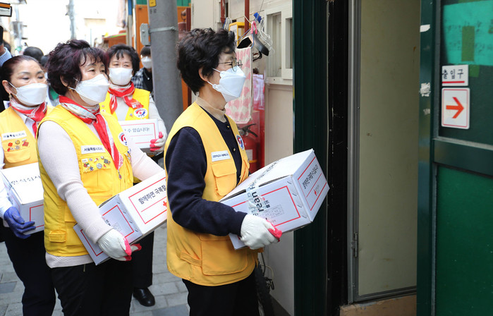 '대한적십자사 서울시지사'가 지난 13일 코로나19 감염병 예방을 위해 서울시내 쪽방촌 재난취약계층 전가구에 긴급구호품을 지원했다. 이번 긴급구호품 지원은 서울시의 협조 요청에 따라 이뤄진 1차 긴급구호품 500가구 지원에 이은 추가 전달로, 서울시내 쪽방촌 재난취약계층 전가구인 총 3085가구에 전달됐다. 사진은 관계자들이 긴급구호품을 전달하는 모습. (사진제공=대한적십자사 서울시지사)