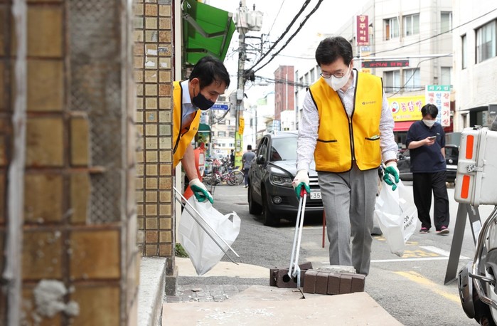 | ▲ 플로깅 캠페인 1호 참가자 정원오 구청장(오른쪽)이 쓰레기를 줍고 있는 모습. (사진제공=성동구청) |