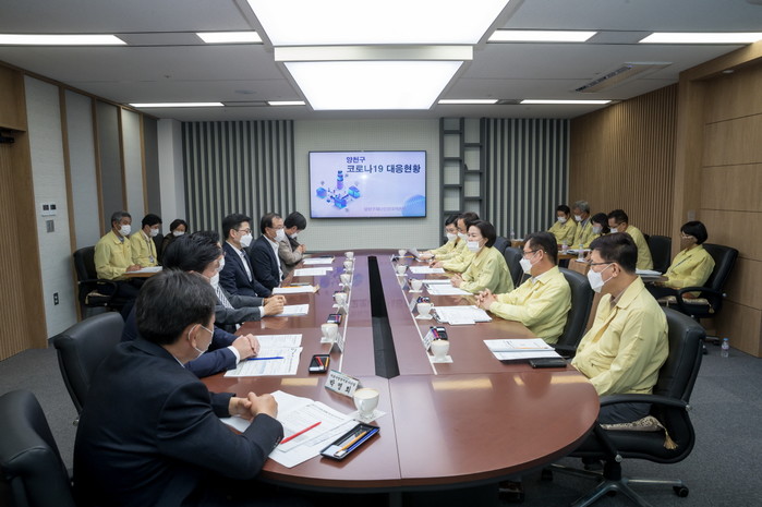 서울 양천구는 코로나19에 효율적으로 대응하기 위해 지역내 유관기관과 복지·방역 관련 민간대표가 모인 ‘양천 코로나19 방역협의회’를 구성했다. 사진은 김수영 구청장(오른쪽 가운데)이 최근 열린 양천 코로나19 방역협의회에서 그동안의 추진실적과 문제점, 협조사항 등에 대해 논의하고 있는 모습. (사진제공=양천구청)