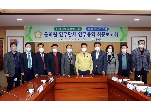 | ▲ 영암군의원 연구단체가 지난 2020년 12월 16일 연구용역 최종보고회를 마치고 전동평 영암군수(가운데)와 기념촬영을 하고 있다. / 사진=영암군의회 제공 |
