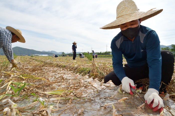 이들이 찾은 용주면 고품리 1,000여평의 양파밭은 잦은 비까지 내려 이미 수확기를 넘긴 상태로 군의원과 의회사무과 직원 20여명은 이날 양파줄기를 베고 비닐을 걷는 등 구슬땀을 흘리며 수확작업을 거들었다.