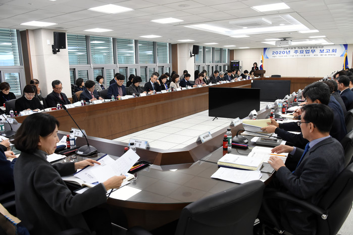 [부산=최성일 기자] 김석준 부산광역시교육감이 17일 오후 1시30분 시교육청 별관 4층 전략회의실에서 본청의 간부들과 3개 직속기관장, 11개 공공도서관장 등 60여명이 참석한 가운데 열린‘2020년 직속기관 및 공공도서관 주요업무 보고회’에서 회의를 주재하고, 업무보고를 받고 있다.