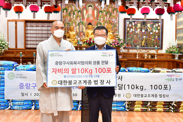 서울 중랑구는 24일 대한불교조계종 법장사로부터 자비의 쌀(백미 10kg) 100포를 전달받았다. 성품은 지역내 취약계층을 돕기 위해 중랑구사회복지협의회를 거쳐 중랑푸드마켓 면목점에 전달될 예정이다. 사진은 전달식에서 류경기 구청장(오른쪽)이 퇴휴 스님과 기념촬영을 하는 모습. (사진제공=중랑구청)