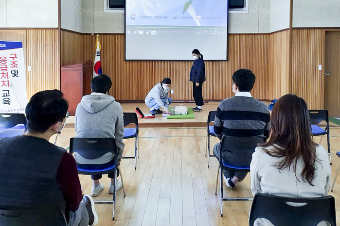 경상대학교 응급의학과 전문의 성애진 교수로부터 응급처치와 심폐소생술의 기본적인 내용과 중요성 등에 대한 이론 교육 후 교육 참가자들의 심폐소생술과 자동심장충격기(AED)를 직접 실습해보는 시간을 가졌다.