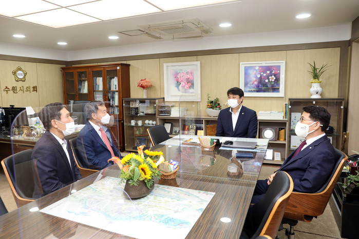 [수원=임종인 기자] 경기 수원시의회 조석환 의장과 김기정 부의장이 최근 의장실에서 성균관대학교 신동렬 총장, 박선규 부총장과 주요 현안을 논의했다.