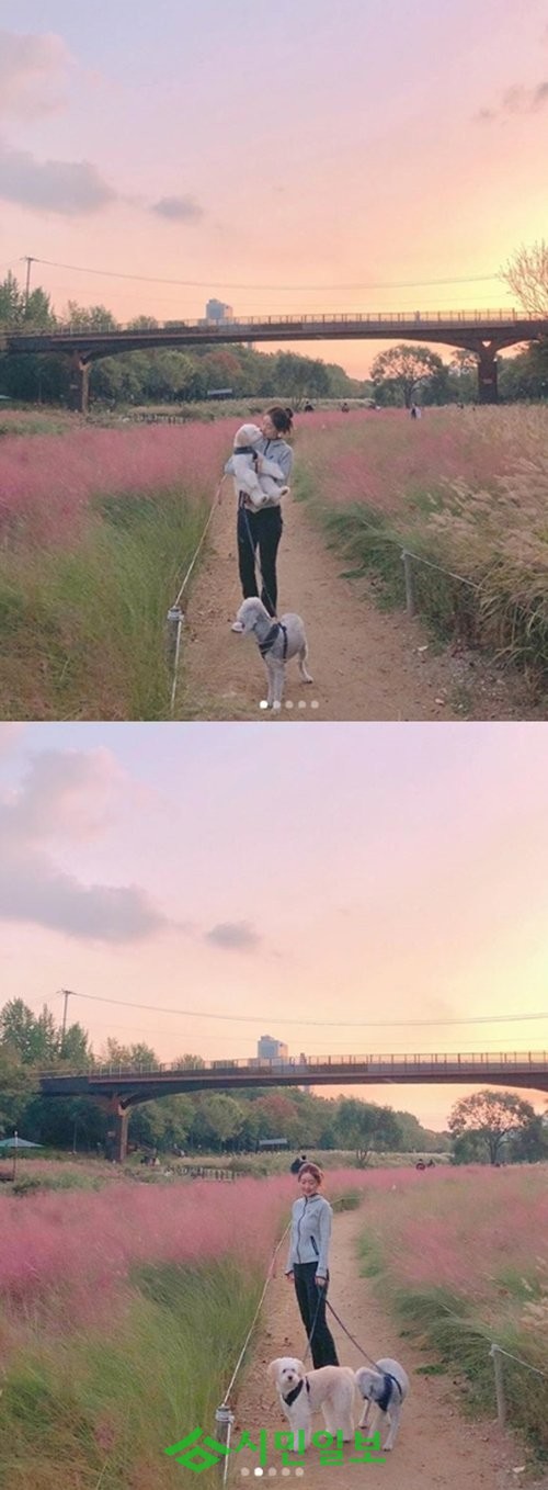 사진에는 홍수아가 분홍빛으로 물든 하늘과 핑크뮬리를 배경으로 반려견들과 행복한 시간을 보내고 있는 모습이 담겨 있다.