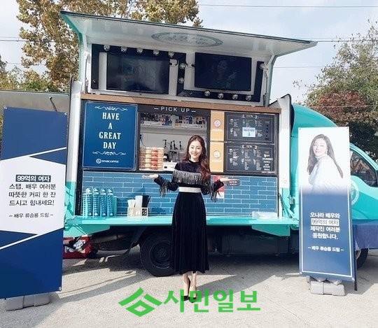 공개된 사진 속 오나라는 류승룡이 보낸 커피차를 배경으로 환한 미소를 짓고 있다.