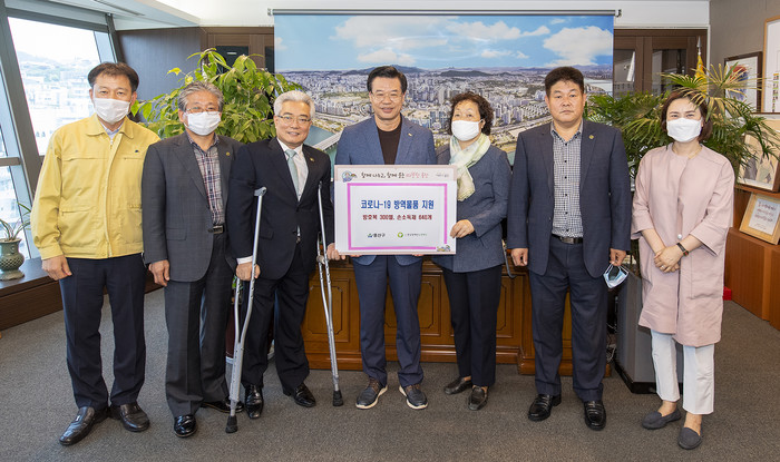 서울 용산구가 최근 한국장애인녹색재단으로부터 코로나19 극복을 위한 방호복 300벌, 손 소독제 640개를 기부 받았다. 물품은 구 보건소 등과 지역내 장애인복지시설에 배부된다. 사진은 성 구청장(가운데) 과 관계자들이 기념촬영을 하는 모습. (사진제공=용산구청)
