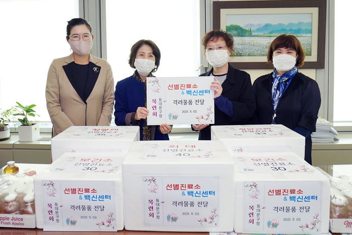 서울 동대문구 간부 부인 봉사회인 ‘목련회’는 2일 코로나19 방역에 노고가 많은 코로나19예방접종센터 및 선별진료소 종사자 400여명을 격려하기 위해 간식세트를 전달했다. 사진은 전달식에서 목련회 관계자들이 기념촬영을 하는 모습. (사진제공=동대문구청)