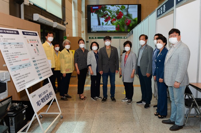 먼저 의원들은 중랑구 제2예방접종센터가 설치되고 있는 중랑구청 로비와 중정 텐트를 찾아 예방접종센터 설치 현황 및 운영 계획과 지역내 코로나19 예방접종 현황에 대해 보고받았다.