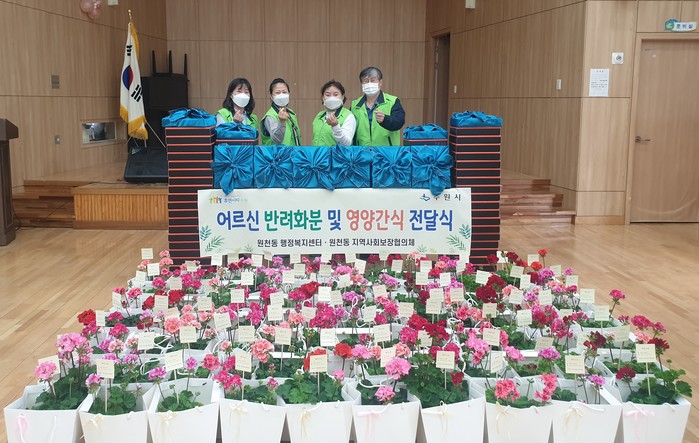경기 수원시 영통구 원천동지역사회보장협의체가 28일 지역내 저소득층 노인 82가구에 ‘반려화분 및 영양간식’을 전달했다. 이 날 반려화분 및 영양간식 전달은 장기화된 코로나19로 인해 심리적으로 불안감과 고독감이 증가한 노인들의 마음건강을 지키고 함께 이겨내고자 하는 취지로 진행됐다. 사진은 관계자들이 반려화분을 앞에 두고 기념촬영을 하는 모습. (사진제공=영통구청)
