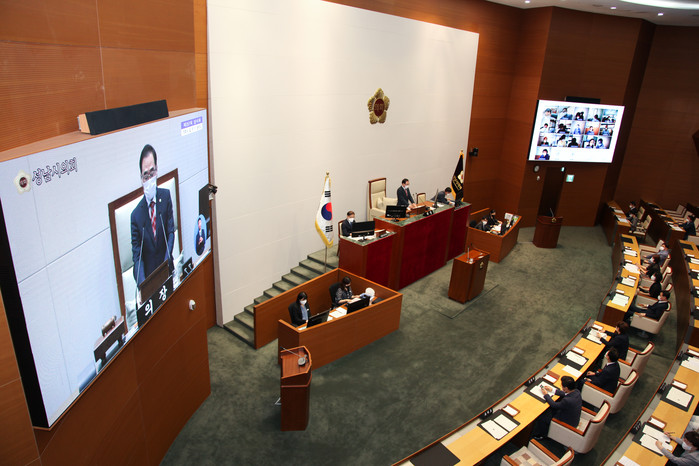 [성남=오왕석 기자] 성남시의회(의장 윤창근)는 3일 열린 제257회 임시회 제1차 본회의에서 시의회 역사상 처음으로 화상회의방식을 도입하며 언택트(비대면)시대에 능동적으로 대응하는 의회 구현에 힘썼다.