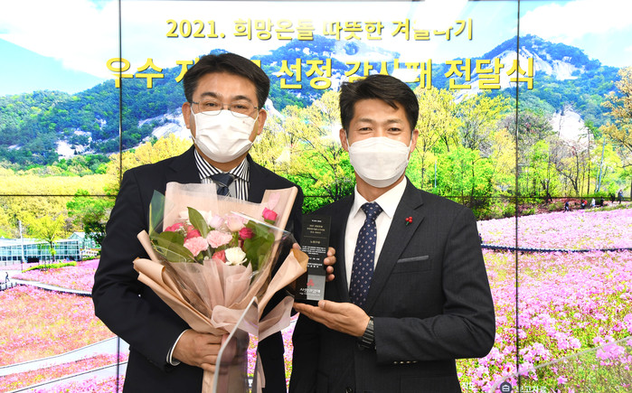 서울 노원구는 최근 서울사회복지공동모금회 ‘2021 희망온돌 따뜻한 겨울나기 우수자치구’로 선정돼 감사패를 받았다. 총 모금액은 27억2528만원으로, 전년대비 현금 모금액은 서울시 자치구 중 1위, 총모금액은 3위를 차지했다. 사진은 감사패 전달식에서 오승록 구청장(왼쪽)이 기념촬영을 하는 모습. (사진제공=노원구청)
