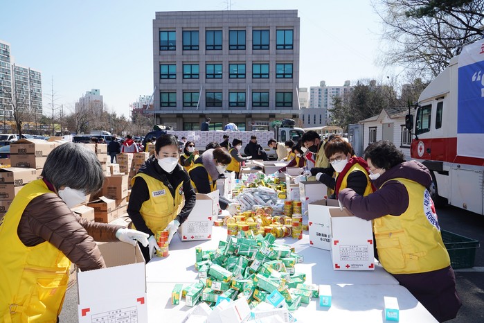 인천 연수구가 16일 대한적십자사 인천지사로부터 코로나19 지역사회 확산 차단을 위한 마스크 등으로 구성된 감염병 대응세트 445개를 전달받았다. 대응세트는 지역내 취약계층에 배부될 예정이다. 사진은 대응세트를 포장하고 있는 적십자 회원들의 모습. (사진제공=연수구청)