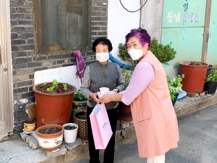 인천 동구 금창동 지역사회보장협의체는 최근 치아결손 등으로 인해 저작 및 소화 기능 저하가 있는 홀몸노인 20가구에 영양죽을 전달하는 '건강지킴이 영양죽 지원사업'을 진행했다. 사진은 홀몸노인에게 영양죽을 전달하고 있는 모습. (사진제공=동구청)