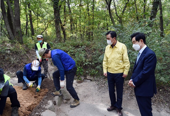 안병용 경기 의정부시장이 최근 '그린시티 의정부, 행복한 숲길 만들기 프로젝트' 추진 현장을 방문해 사업 현황을 살폈다. 사진은 안 시장(오른쪽)과 관계자들이 숲길 만들기 현장을 점검하고 있는 모습. (사진제공=의정부시청)
