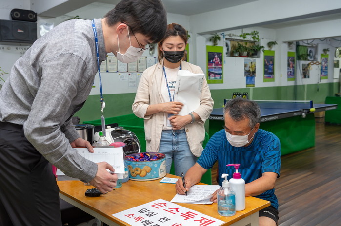 서울 양천구가 코로나19 확산 방지를 위해 지역내 탁구장에 집합제한조치를 통보하고 운영 업소에 대해서는 추후 불시점검을 실시해 방역수칙 위반사항 적발 시 300만원 이하의 벌금을 부과하는 등의 강력한 행정 조치에 나선다. 사진은 탁구장 점검을 하고 있는 구청 직원들의 모습. (사진제공=양천구청)