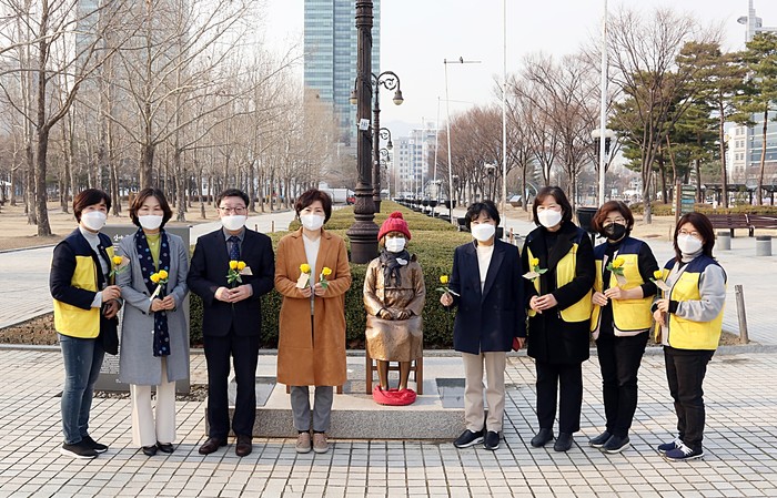 10일 시의회에 따르면 최병일 시의회 부의장, 이호건 더불어민주당 대표의원, 이은희 의원, 윤경숙 의원은 안양여성의전화 등 여성단체 관계자들과 세계 여성의 날을 맞아 안양 평촌 중앙공원에 위치한 ‘안양 평화의 소녀상’을 찾아 램지어 교수를 규탄하고 위안부 망언 논문의 철회를 촉구했다.