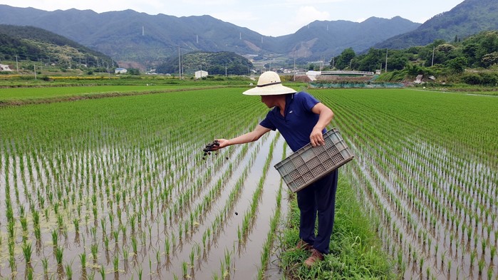 하지만 친환경 벼 재배 논에는 제초제 사용 대신 모낸 후 7일경에 왕우렁이를 10a당 6kg정도 투입하여 우렁이가 논에서 올라오는 풀들을 뜯어먹게 하여 풀이 돋아나지 못하도록 한다.