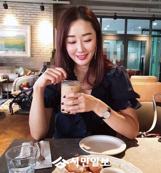 사진 속 김경화는 커피와 빵을 바라보며 행복한 미소를 짓고 있다.
