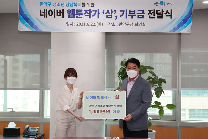 서울 관악구가 22일 네이버 웹툰작가 ‘삼’으로부터 관악구 청소년 복지 증진 후원금 1000만원을 기부받고, 감사장을 수여했다. 이 기부금은 청소년상담복지센터에 전달돼 인터넷 중독 등 위기상황에 놓인 청소년들의 상담 및 사례관리 지원사업에 사용될 예정이다. 사진은 전달식에서 박준희 구청장(오른쪽)과 웹툰작가 삼이 기념촬영을 하는 모습. (사진제공=관악구청)