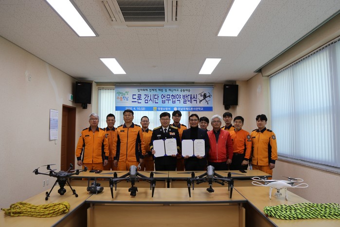 전남 영광소방서가 부족한 산불단속·예방 인력 배치의 한계를 극복하기 위해 최근 호남국제드론사관학교와 업무협약을 체결했다. 협약에 따라 '드론 감시단'을 운영해 화재, 수난, 산악사고 등에 활용할 예정이다. 사진은 관계자들이 기념촬영하는 모습. (사진제공=영광소방서)