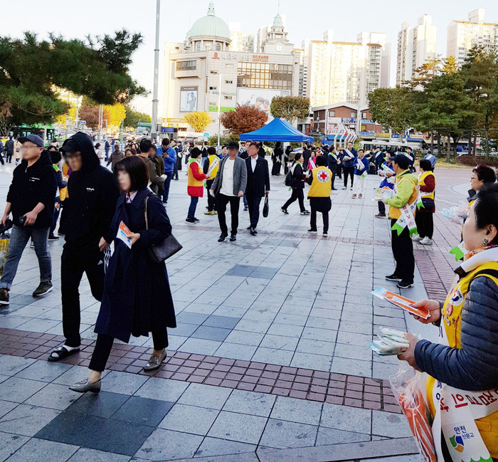 4일 서울 구로구가 구로역 광장에서 구청 직원, 유관기관, 민간기업 관계자, 주민 등 200여명과 함께 ‘안전점검의 날’ 캠페인을 펼쳤다. 사진은 겨울철 안전사고 예방법, 여성안전 서비스, 주택용 소방시설, 가스안전수칙 등에 대한 홍보활동을 펼치고 있는 봉사자들의 모습. (사진제공=구로구청)