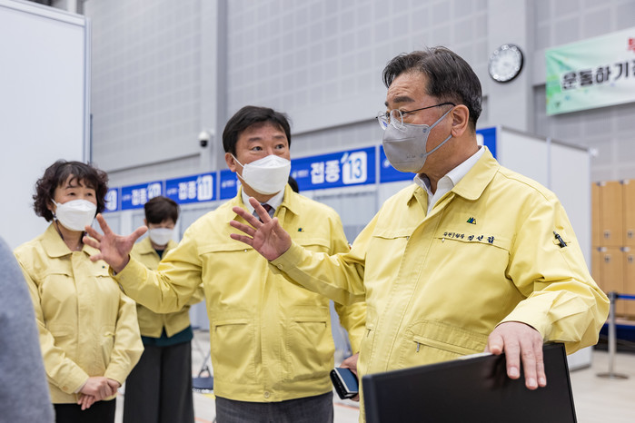 김선갑 서울 광진구청장은 최근 광진구 백신접종센터가 들어서는 자양체육관을 찾아 전반적인 시설 구조와 접종 후 대기구역 등을 살펴보고, 초저온냉동고와 예비 냉동고 상태를 확인하는 등 운영 준비현황을 살폈다. 사진은 김 구청장(오른쪽)이 백신접종센터를 방문해 직원들과 대화를 하는 모습. (사진제공=광진구청)