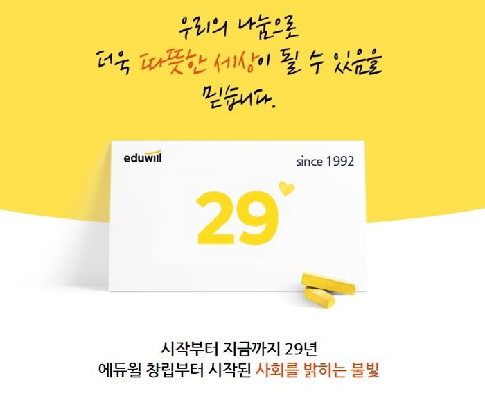 에듀윌 사회공헌위원회 양형남 회장은 “1992년 창립 당시부터 오랜 시간 교육이 필요한 곳에 나눔 활동을 꾸준히 진행하고 있다”고 말하며 “현재 진행 중인 사회공헌활동 외에도 지역사회 이웃들을 위한 다양한 활동을 기획, 진행할 것”이라고 전했다.