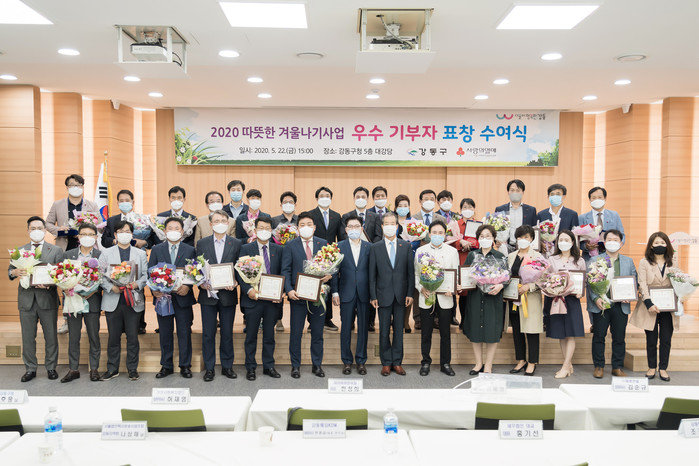 이정훈 서울 강동구청장이 최근 구청 5층 대강당에서 ‘2020 희망온돌 따뜻한 겨울나기’ 우수기부자로 선정된 33명 중 23명에게는 구청장 표창장을, 10명에게는 사회복지 공동모금회 표창패를 전달했다. 사진은 표창 수여식 후 기념촬영을 하고 있는 이 구청장과 수여자들의 모습. (사진제공=강동구청)