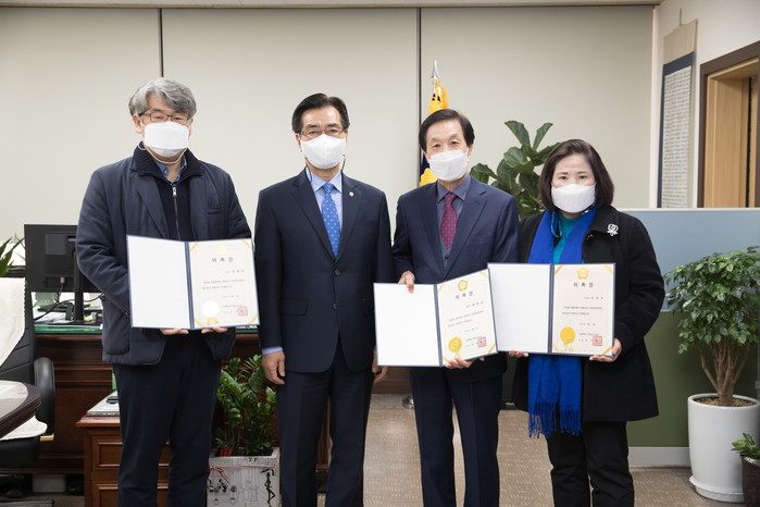 | ▲ (왼쪽부터) 강동순 회계사, 고기판 의장, 정찬선 세무사, 이미자 의원이 기념촬영을 하고 있다. (사진제공=영등포구의회) |