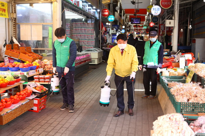 | ▲ 홍국표 부의장이 전통시장에 방문해 방역활동을 하고 있다. (사진제공=도봉구의회) |