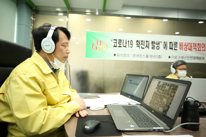 구로구가 21일 확대간부회의를 각자의 사무실 자리에서 PC와 화상회의 장비를 이용한 비대면 영상회의로 개최했다. 이날 회의에는 각 부서장·동장 등 구 간부 68명이 참여했다. 사진은 회의를 진행하고 있는 이성 구청장의 모습. (사진제공=구로구청)