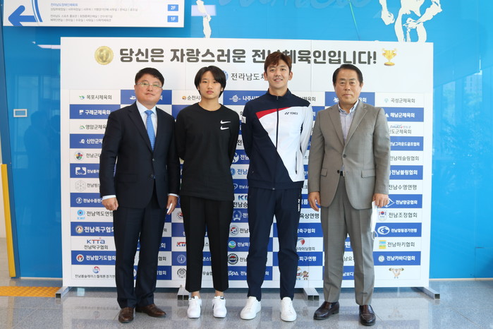 | ▲ 왼쪽부터 김영섭 전남배드민턴협회장, 안세영, 이용대, 김재무 회장(출처=전라남도 체육회) |